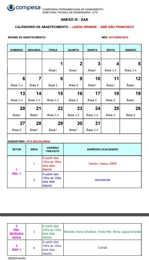 Veja o calendário de abastecimento de água da Compesa em Lagoa Grande.