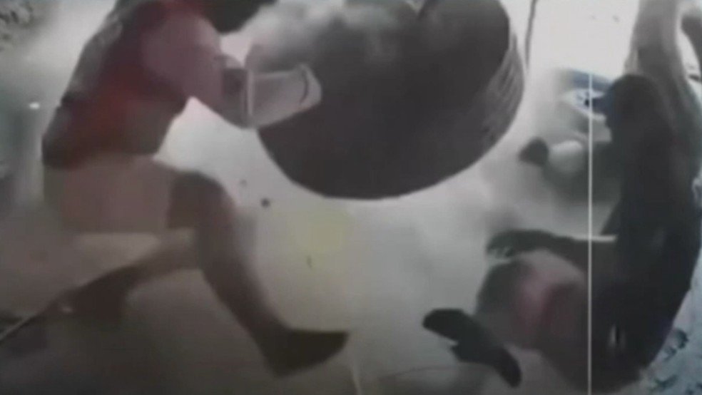 Uma câmera de segurança do estabelecimento registrou o momento do acidente. Os funcionários estavam enchendo a câmara de ar do pneu quando ele estourou, jogando os homens contra o chão.
