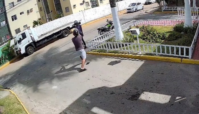 • O criminoso guarda a arma e entra no condomínio.