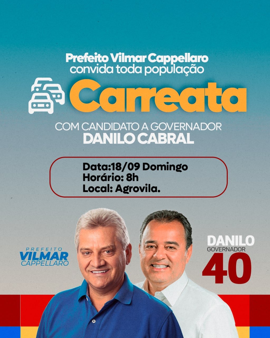 Faltando exatos 15 dias para a eleição, Vilmar Cappellaro traz para Lagoa Grande o candidato ao governo de Pernambuco, Danilo Cabral (PSB), para uma grande carreata neste domingo (18). Além de Danilo, o ato já teve a confirmação da presença da candidata ao senado, Tereza Leitão e vários candidatos à deputado estadual e federal. A concentração vai acontecer a partir das 8h da manhã, no Bairro Agrovila, na sede do munícipio