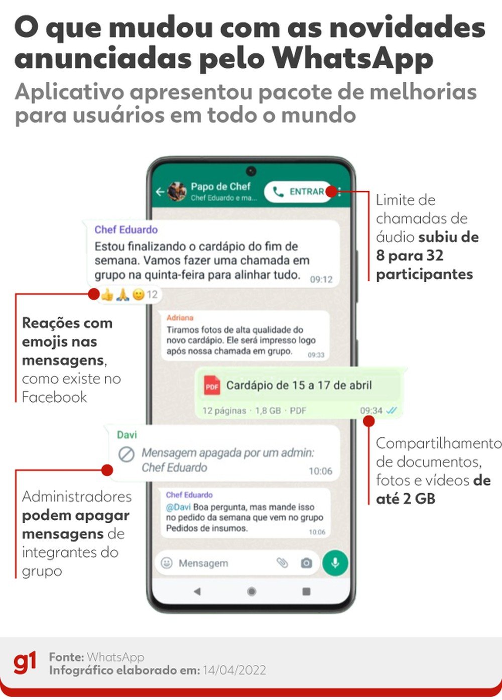 Em breve, os usuários do aplicativo vão poder reagir a uma conversa só com emojis, como já é possível fazer no Facebook, compartilhar arquivos de até 2GB e os administradores de grupos vão poder apagar mensagens de conversas.